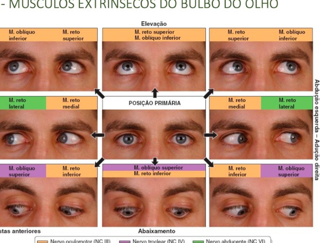 Identifique os músculos motores primários e sua inervação em cada posição cardinal do olhar. São 8 posições × 3 perguntas = 24 questões.